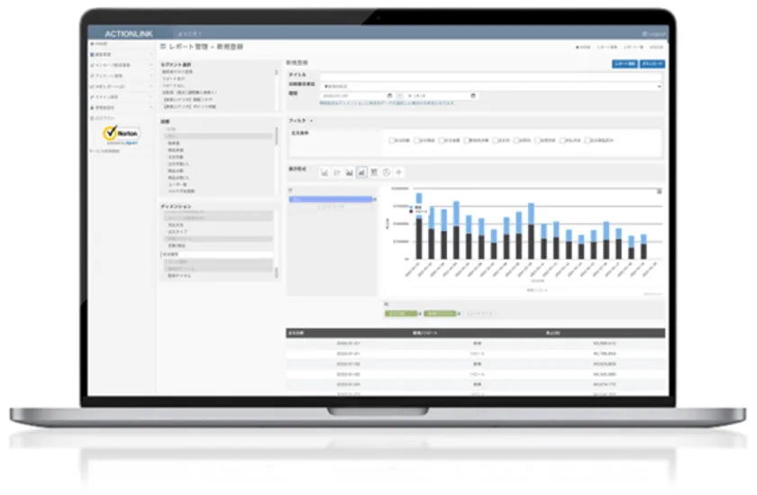 アクションリンク導入によって顧客データ、商品データ、注文履歴、閲覧履歴などCRMに必要なデータを顧客軸で1つに統合し、誰でもその場で分析、予測、配信などのマーケティングに活用できるシステム環境を実現します。