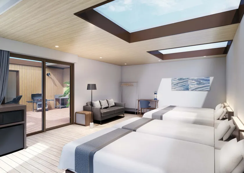 客室からも星空をお楽しみいただけるよう、建築物としての認定を受けたドームテント、ヴィラ型コンテナを導入いたします。