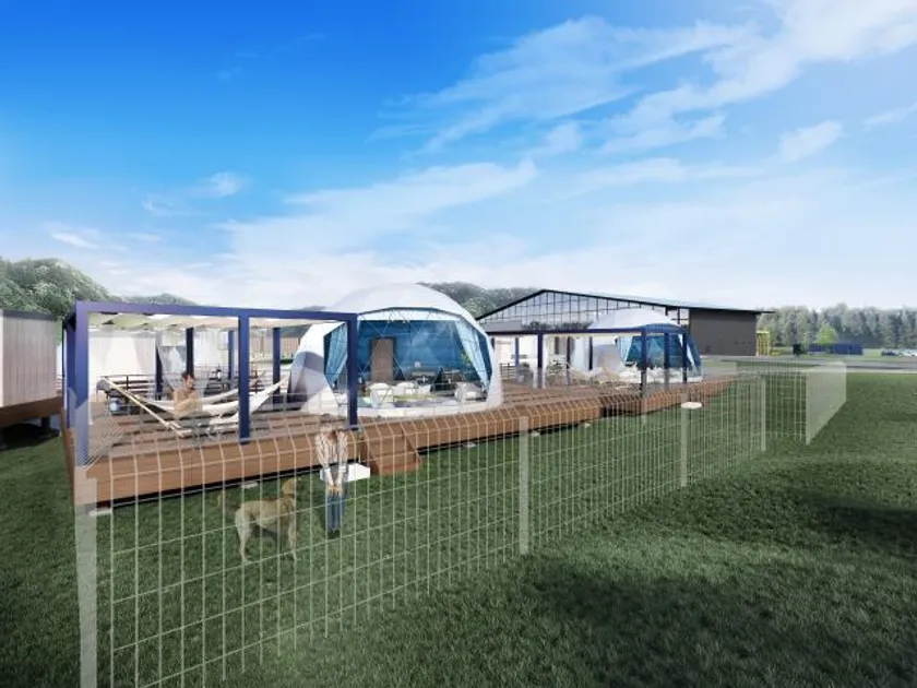 通常のドームテント、ヴィラ型コンテナとは別に、わんちゃんご利用可能なドームテントも提供いたします。各客室には専用ドッグランを設けておりますので、他のお客様に気を遣わずにお楽しみいただけます。専用のお手洗い(トイレ・洗面)、シャワーブースを設置しております。