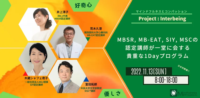 マインドフルネスプロジェクトは、2022年11月13日にProject:Interbeingを主催します。Project:Interbeingでは、1日で4つの代表的なマインドフルネスのプログラムを体験できる機会を提供いたします。各プログラムの一線で活躍する素晴らしい講師陣をお迎えします。