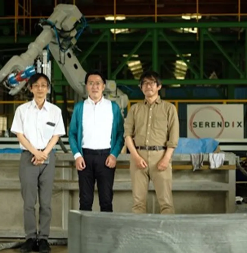 国内最大60m2出力可能な3Dプリンター前で 左からKAP社桐野氏、セレンディクス飯田 KAP社岡村氏
