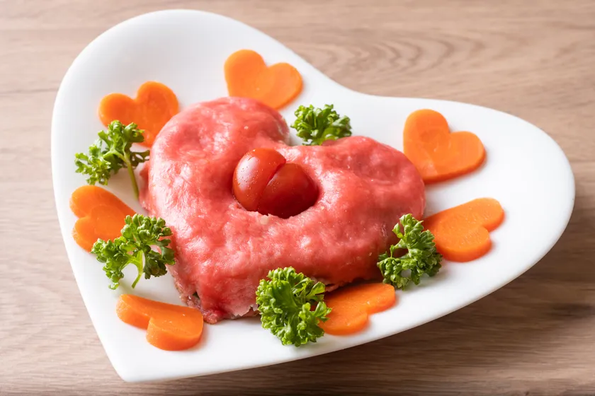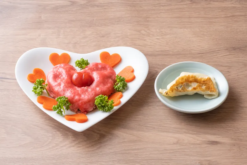 餃子は当店こだわりの焼き餃子の素材をベースに、食紅を練り込んだ鮮やかなピンク色の皮で包み、かわいらしいハート型に成形。餃子の中央部と周りにハートをかたどったミニトマトとにんじん、パセリを添え、味も見た目もキュンキュンする、夏らしい彩りに仕上げました。