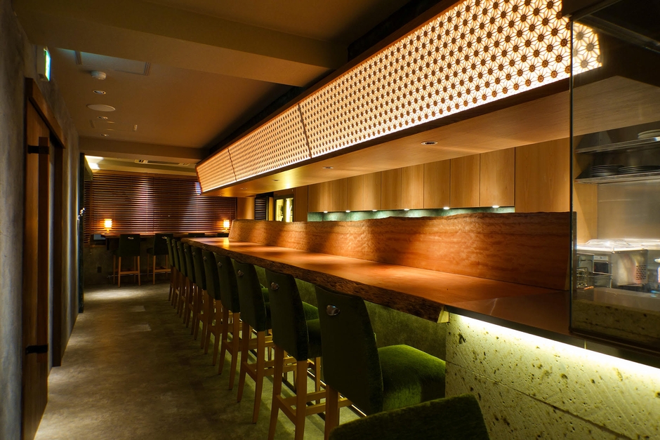 宮大工さんの作るオーダーメイドの桜柄の吉祥組子が飾られていたり、大理石に囲まれライブ感のあるガラス張りの焼き場も見えるので、料理の味を舌で楽しみながら目でも楽しむことが可能。
