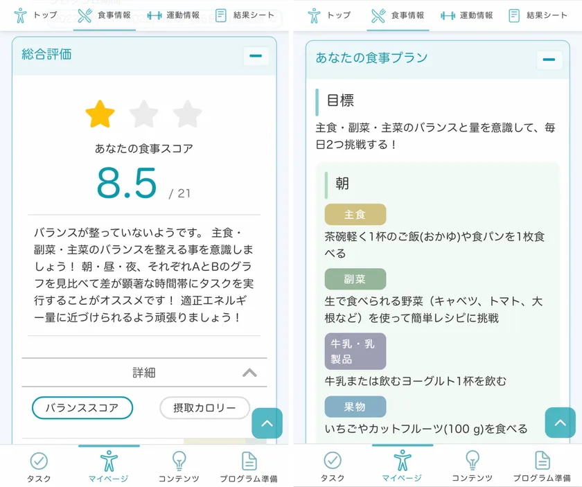管理栄養士とトレーナーが、従業員様の現在の食生活・運動習慣・体組成・生活習慣をもとに分析します。その結果を元に、食事・運動習慣の改善を目的とした“パーソナルプラン”を立案。低ハードルな健康タスクをクリアしていくシステムで、体組成数値改善と健康習慣づくりを目指します。持病やアレルギー、好き嫌いにまで配慮した専用プログラムなので、無理なく毎日継続できます。