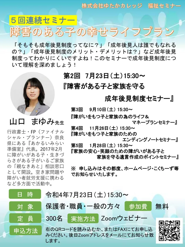 講師には、行政書士、ファイナンシャル・プランナーとして活躍中の山口 まゆみ先生をお迎えし、第2回は「障害がある子と家族を守る成年後見制度セミナー」と題して2022年7月23日(土)に開催します。「そもそも成年後見制度ってなに?」「成年後見人は誰でもなれるの?」「成年後見制度のメリット・デメリットは?」といった疑問をお持ちの保護者の皆様に、成年後見制度の理解を深めていただける構成としました。