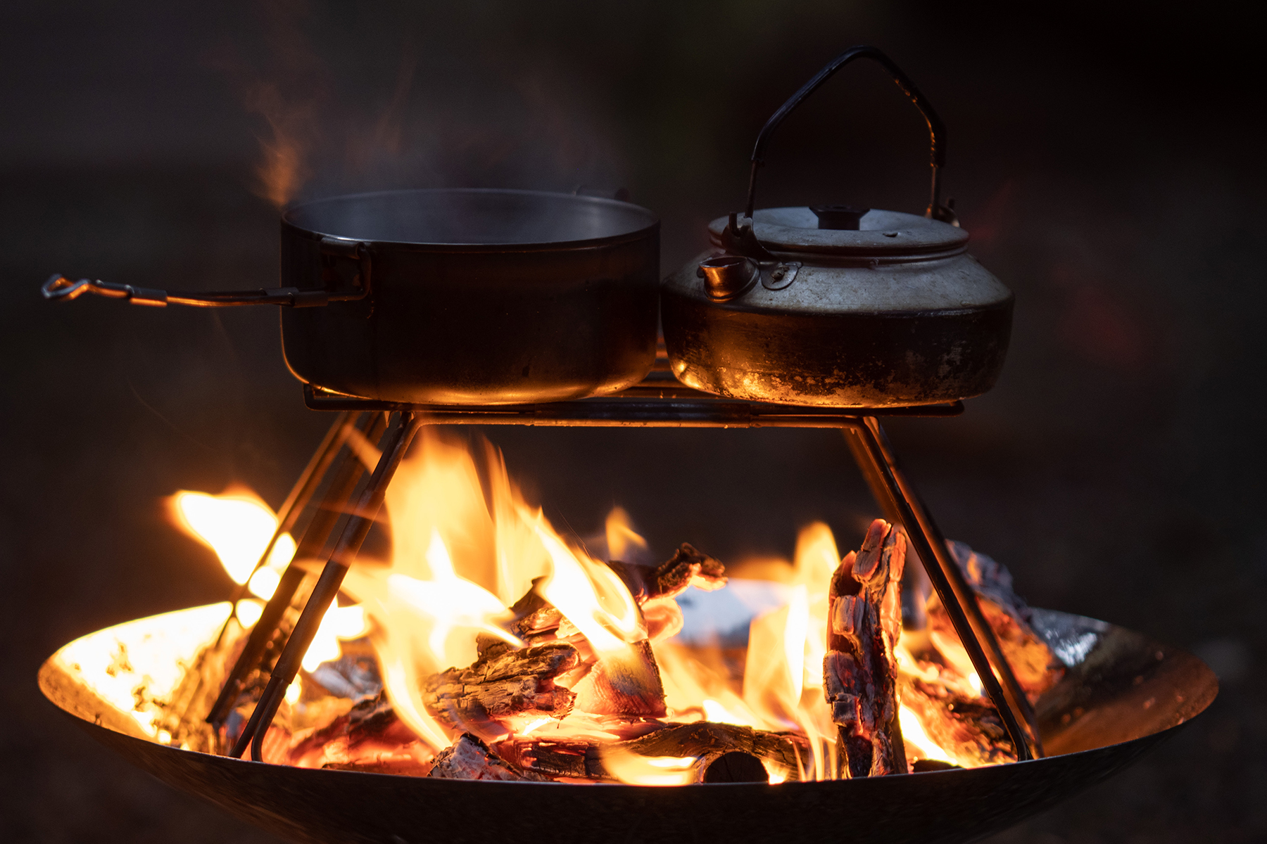 焚き火の上に置くだけで、そこが調理台になる道具を考え出したのは必然だったのかもしれません。「サラマンダーの檻」は、焚き火台、バーナー、地面に直で燃やす焚き火、炎の上に設置するだけでそこがキッチンになってしまうすぐれもの。たっぷりとした鍋に湯を沸かして作るパスタも、持つだけでワークアウトになりそうな重いスキレットでのステーキも、もちろん食後の舌が火傷するくらいのコーヒーをいれる時にも活躍します。炎の中に住む火トカゲの妖精サラマンダーとあなたのちょうどいい距離、約15cmのディスタンスは熾火(おきび)の上でじっくり火を通すのに最適な距離。数秒で設営でき、あなたが愛着がわいて手放したくなくなるほどの年月までシンプルで長持ちする道具です。7歳の子供がこの道具を見て叫びました、「名前は『炎のキッチン』にすればいいよ!」と。子供は時に素晴らしいアイデアをいうものです。