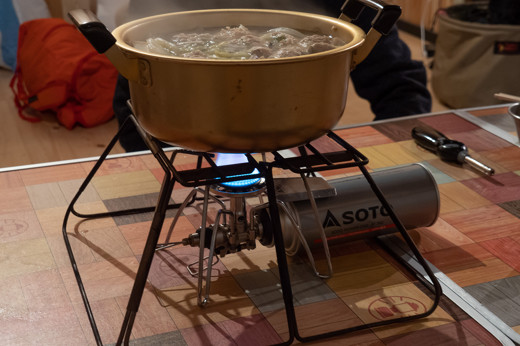 それならば、と思ったキャンプに慣れているあなたの読み通り、キャンプテーブルに置かれたワンバーナーの上にセットすれば、無敵の安心感を得るでしょう。向かいに置いたボトルを取る際に、鍋をひっくり返す悲劇とお別れしても良い時期ですね。
