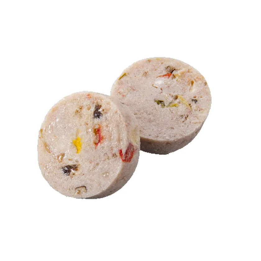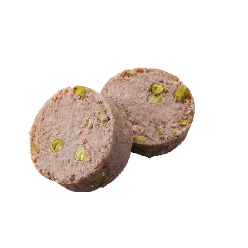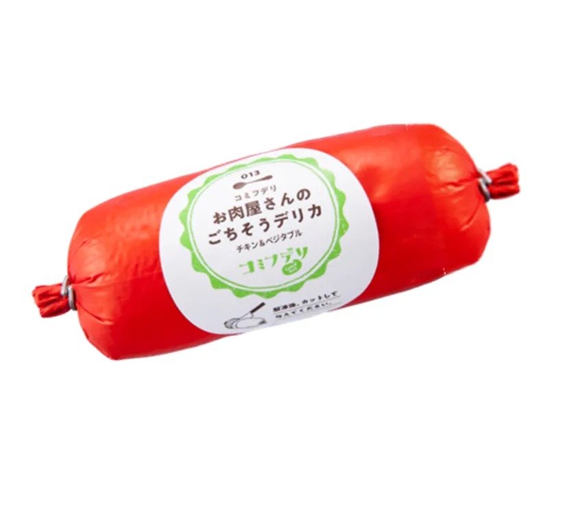 お肉好きの愛犬のための新メニュー。お肉好きの愛犬にお肉屋さんならではの美味しさをお試しください!お好きな量をカットして食べさせるタイプですので、与える量も調整頂けます。フレーバーは、「チキン&ベジタブル」「ポーク&チーズ」「馬肉&ポテト」の3種類をご用意しています。