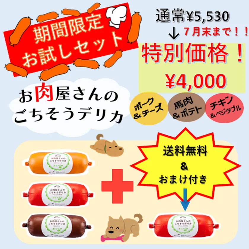 「お肉屋さんのごちそうデリカ」の3フレーバーに「チキン&ベジタブル」が1本おまけでついてくるお試しセット。通常5,530円のところ、送料無料かつ特別価格の4,000円で販売します。販売は、公式オンラインストア「Hot Dog Store」限定です。