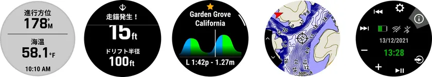 左から進行方位、アンカードラッグ、潮流データ、BlueChart g3沿岸地図、Fusion(TM)-Link