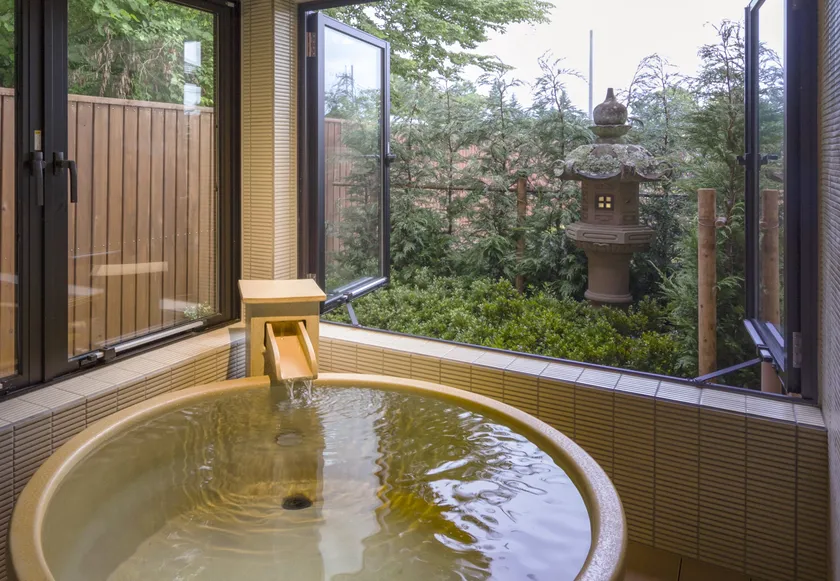 半露天風呂付60~70平米以上の贅沢な客室。“お好きな時間”、“何度でも”マイ湯浴みを楽しめるように、ゆったりと癒しの温泉を満喫ください。
