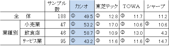 電子レジスター(*)「カシオ」のシェアがトップ。 「2022年電子レジスター調査」