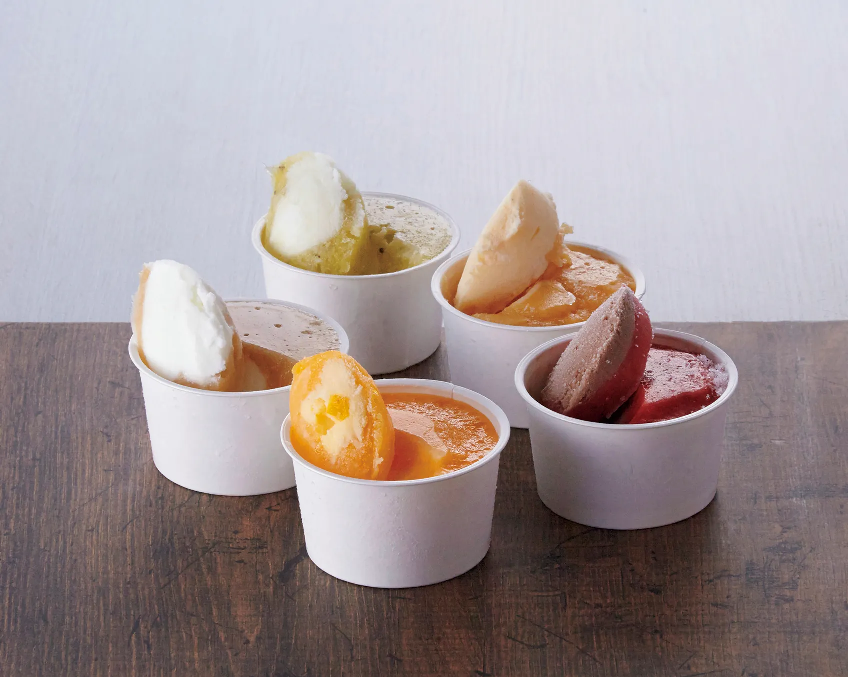 和歌山県産の桃、八朔、柿、キウイ、イチゴ(まりひめ)を使ったジェラート
