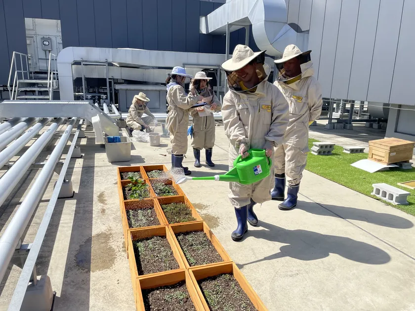 有志で「園芸部」を結成し、ホテルの屋上にハーブや花などを植えて緑化を進めています。育てている植物は、同じくホテル屋上で育てている都市養蜂のミツバチによって受粉し、花粉はハチミツの元となり、小さな循環が生まれます。