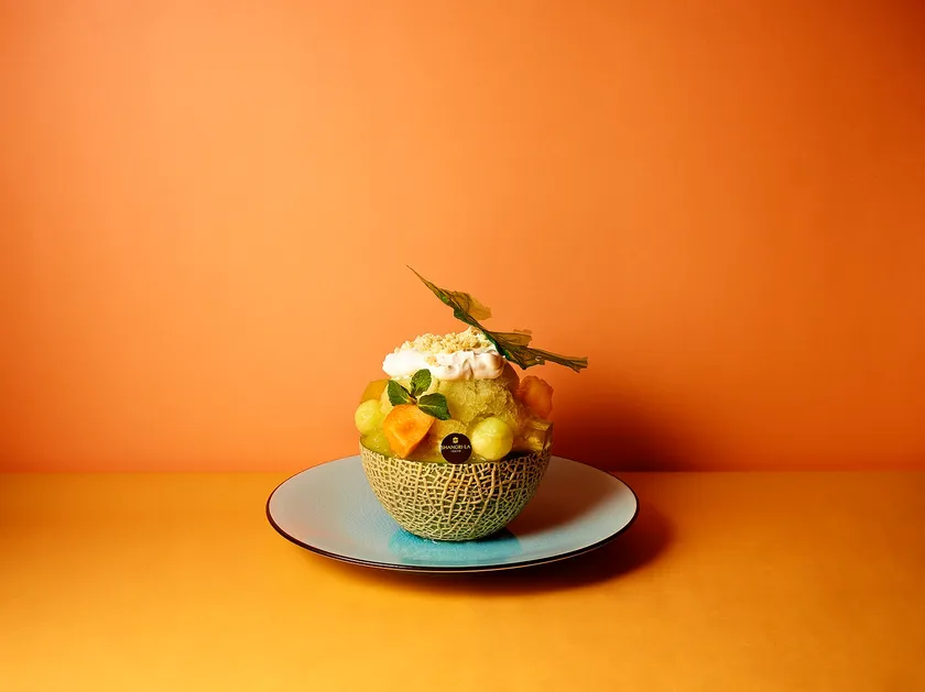 大人気のメロンかき氷の季節が到来。半分にカットしたメロンを器に、たっぷりのメロン果肉に加え、果汁100%のフレッシュメロンジュースを凍らせて削った氷は、ほぼ1個分のメロンを使用します。杏仁豆腐やココナッツの焼きメレンゲ、オーギョーチゼリー、ホイップクリームを贅沢にトッピングし、さらに口の中で弾けるパチパチキャンディを忍ばせた一品は、爽やかなサプライズが詰まり、さまざまな食感を味わっていただけます。