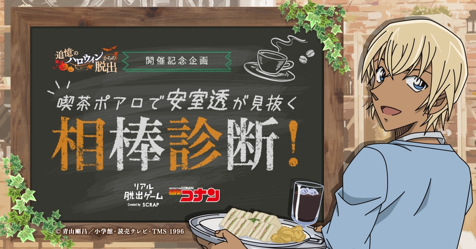 株式会社SCRAP(本社:東京都渋谷区 代表:加藤隆生)は、大人気テレビアニメ「名探偵コナン」とコラボレーションしたリアル脱出ゲーム『追憶のハロウィンからの脱出』の開催を記念し、Webの無料診断コンテンツ「喫茶ポアロで安室透が見抜く相棒診断!」を公開いたします。