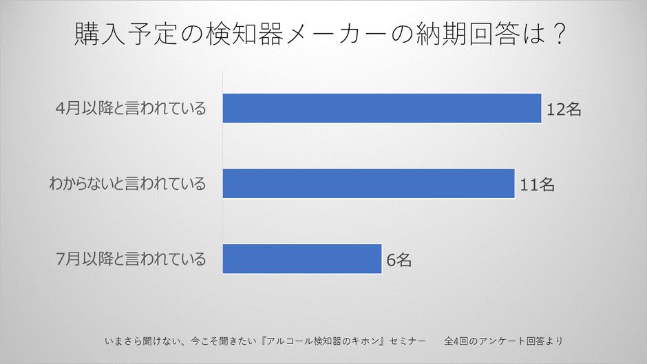 当社ではここ半年、千葉県の飲酒事故を端緒として改正された道交法施⾏規則について、事業者向けのセミナーを多数開催してまいりました。参加企業のアンケート結果から、アルコール検知器の準備状況、安全運転管理者選任事業所における点呼や飲酒チェック体制、教育体制等、事業者側の⼾惑いが垣間⾒えます。