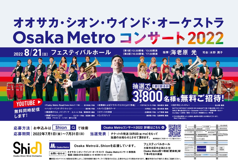 大阪市高速電気軌道株式会社(Osaka Metro)と公益社団法人大阪市音楽団(Shion)は、2022年8月21日(日)にフェスティバルホールで開催するオオサカ・シオン・ウインド・オーケストラによる「Osaka Metro コンサート2022」に、抽選で3,800名様を無料でご招待します。合わせて、当日、会場にお越しになれない方向けにコンサート映像を無料でライブ配信します。