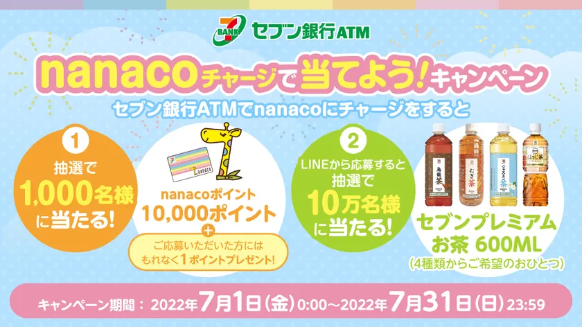 株式会社セブン銀行(本社:東京都千代田区、代表取締役社長:松橋 正明、以下 セブン銀行)は、2022年7月1日から2022年7月31日まで、nanacoポイントやセブン-イレブンで使えるクーポンが当たる「nanacoチャージで当てよう!キャンペーン」を実施します。