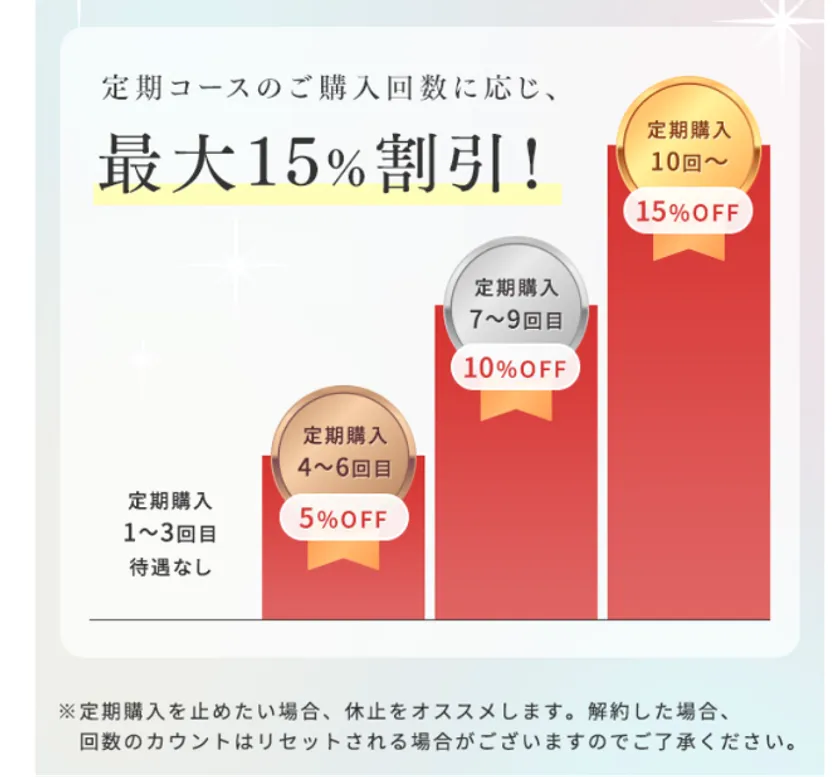 長くご愛用していただきたいという思いから、最大で15%割引になる定期お届けコースの継続割引を採用しました。使い続けるほどお得な値段設定となっています。また、定期コースに関しては受け取り回数の縛りなどもなく、いつでも休止・解約(※8)いただけます。
