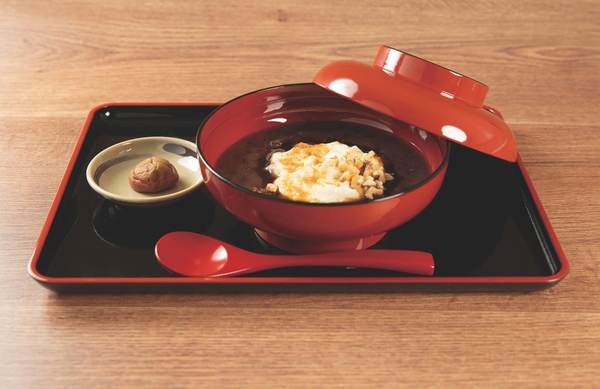水気を切って粗く砕いた絹ごし豆腐に、くるみと黒蜜きなこのコクが加わった、至極の一品です。直火銅釜で炊き上げた、上品で優しい味わいのあんことのハーモニーをお楽しみください。箸休めの甘酸っぱい和歌山県産南高梅がアクセントです(梅干しには蜂蜜を使用しています)。