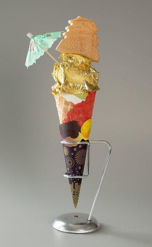 珍しい紅白のコーンに盛り付け、「花火と月明かり」や「桜吹雪」など日本の風景を描いたスリーブに入れています。お城のもなかに和傘のオブジェが乗って、どこから見ても、ザ・NIPPONな、豪華絢爛なソフトクリームです。