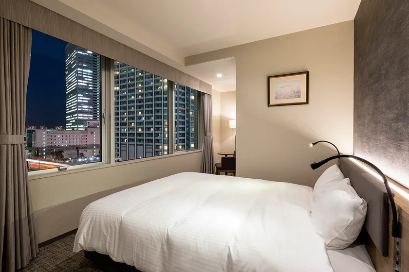 首都高と東京湾が見えるダブルルーム・ツインルームでは、大きめのベッドで快適な睡眠をご提供。