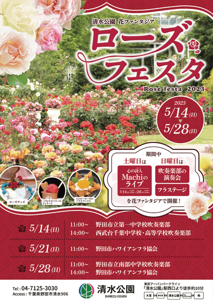 清水公園の花ファンタジアにて、約1,200株の春バラの最盛期に合わせて「ローズフェスタ」を開催します。ローズフェスタ期間中の土曜・日曜日にはハワイアンフラやミニライブ・吹奏楽部の演奏会などのイベントや、花ファンタジア内のカフェでもバラにちなんだメニューも提供し、満開のバラをより一層楽しむことができます。