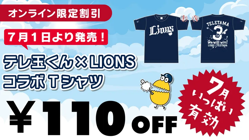 ▼テレ玉アプリ開設を記念して、オンラインストア「テレ玉家」で使える、アプリ利用者限定の割引販売を実施中!「テレ玉×ライオンズコラボTシャツ」をお得にGETしよう!