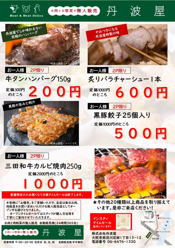 食肉加工品の製造・卸売・EC販売を行う株式会社丹波屋(本社:大阪府大阪市、代表取締役:松田 益睦)は、2022年7月2日(土)に無人販売店と自動販売機によるお肉惣菜の販売を開始します。