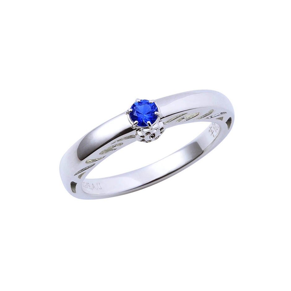 甲丸フォルムに大粒のイメージカラーストーンをセットし、内側には名前刻印を施しました。石座部分には日輪刀の鍔をさりげなく取り込んだクラシカルなデザインです。