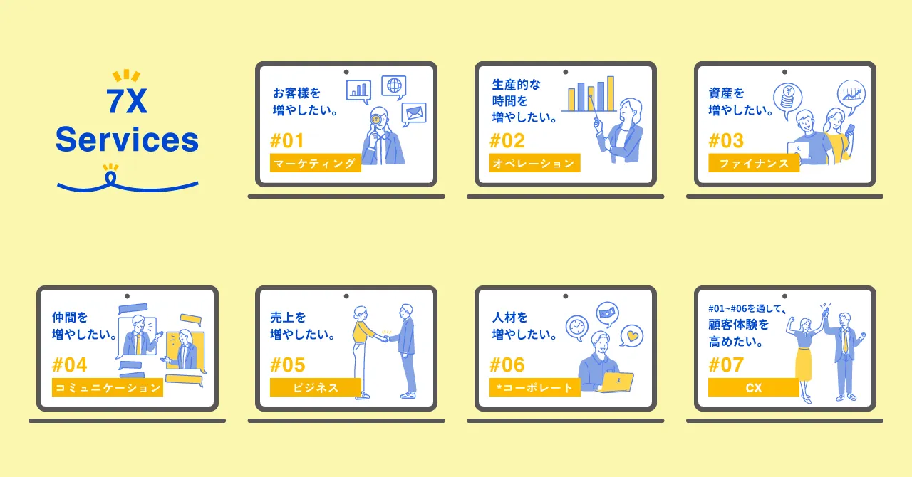 「Hirameki 7(ヒラメキセブン)」は、顧客獲得に必要なマーケティング機能をはじめ、業務フローの効率化、そして経営改善まで、 中小企業の業務をデジタル化によって幅広く支援する「DXの7つの領域」をカバーしています。