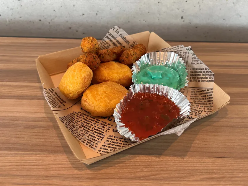 鮫肉を使用したナゲットとカツフライに、ピリ辛な赤いサルサソースとレモンの爽やかな青いマヨネーズソースをトッピング!