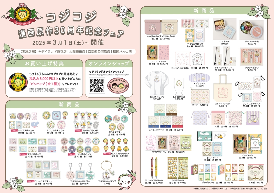 本日公開した原作漫画30周年記念ロゴは、コミックス第1巻の扉絵をオマージュして作成しました。2025年3月1日(土)からキデイランド原宿店1階Kスポットをはじめとするキデイランド4店舗で開催される「コジコジ 漫画原作30周年記念フェア」では、30アイテム以上の新商品を販売。新商品には、アニバーサリーロゴと同じく、コミックス第1巻の扉絵をもとに作成したイラストなどを使用し、淡い色合いで年代関係なく使えるアイテムを多数ご用意しております。