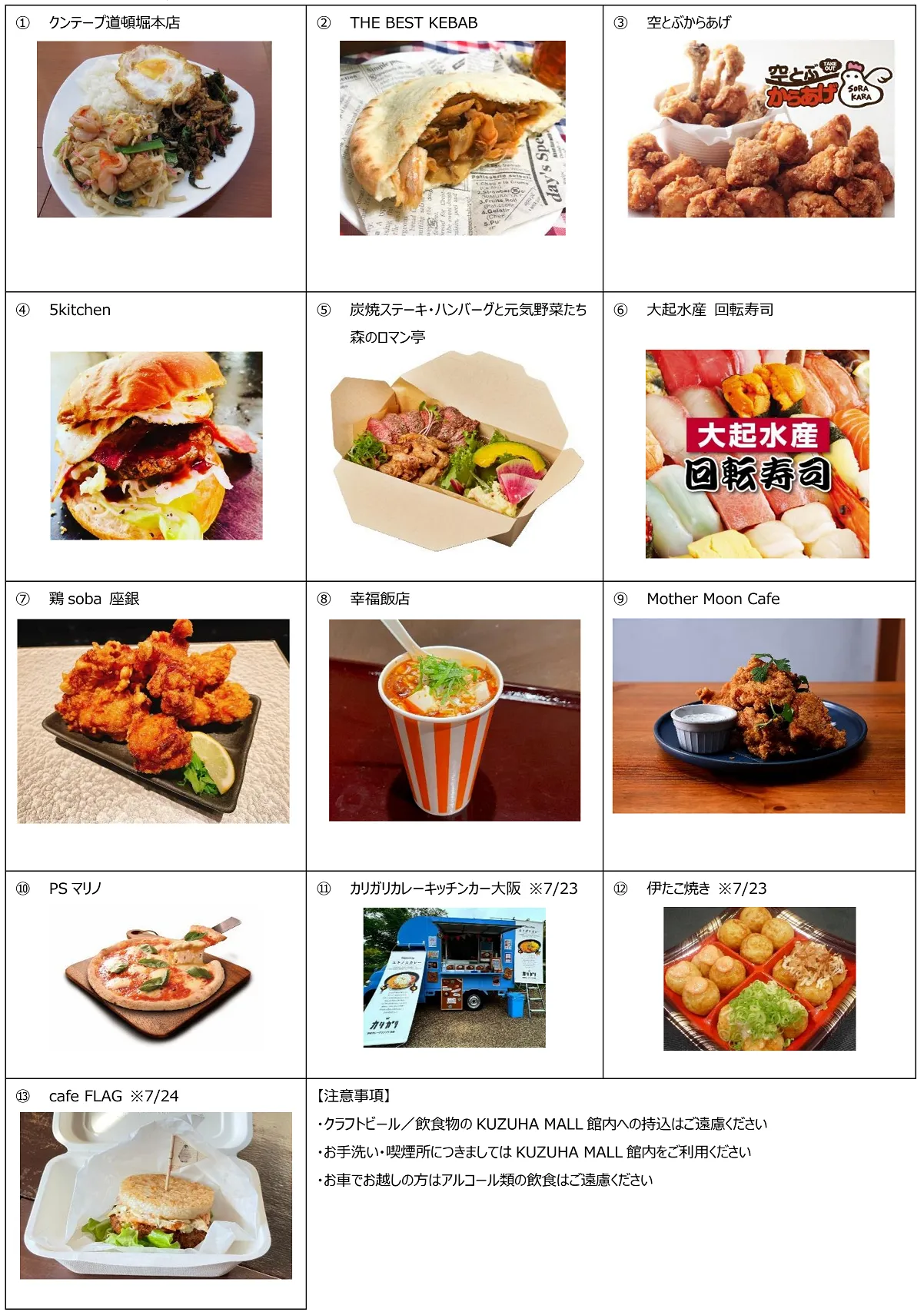 近隣のクラフトビールをはじめ、タイ料理、トルコ料理などのキッチンカーやKUZUHA MALL館内の飲食店舗等が集結する飲食イベントです。