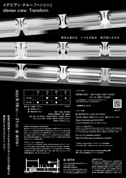 イデビアン・クルー 座・高円寺 夏の劇場12『ヘンシン』が2022年8月18日(木)~8月21日(日)に座・高円寺1(東京都杉並区)にて上演されます。チケットはカンフェティ(運営:ロングランプランニング株式会社、東京都新宿区、代表取締役:榑松 ⼤剛)にて発売中です。