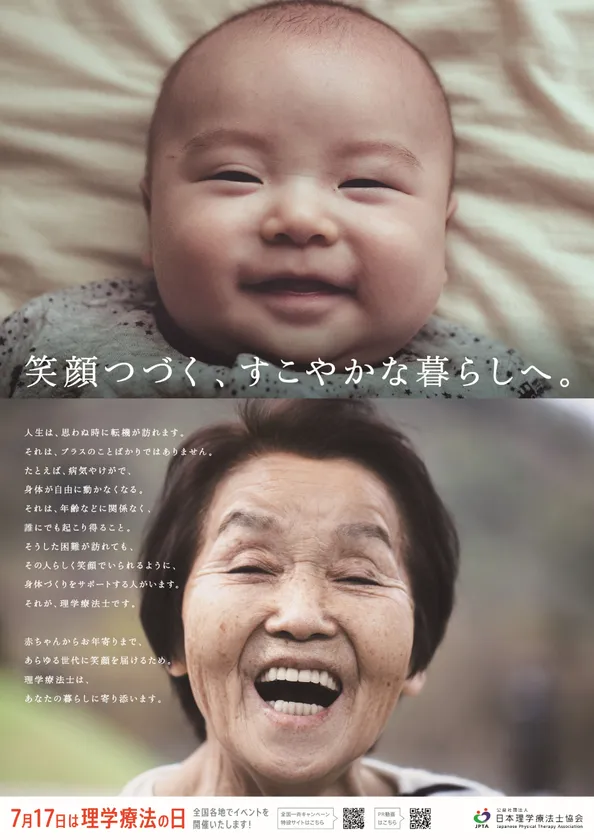 公益社団法人日本理学療法士協会(所在地:東京都港区六本木)は、7月17日の「理学療法の日」にちなんで、2022年7月17日(日)、各都道府県理学療法士会の協力のもと、全国一斉キャンペーンを開催します。また、当日17日には第10回「笑顔をあきらめない。」写真コンテストの受賞作品を発表します。詳細は本会ホームページ「理学療法の日」特設サイトにてご覧いただけます。