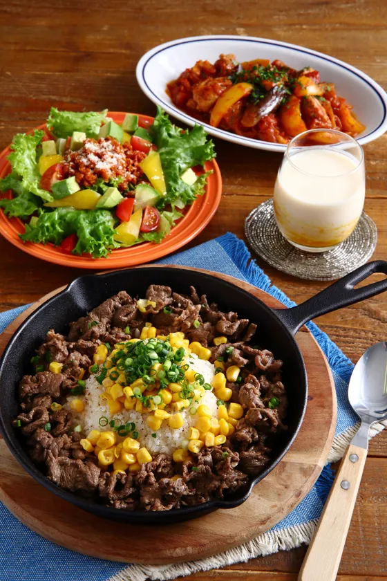メニュー :ビーフのガーリックピラフ/糀甘酒ラッシー