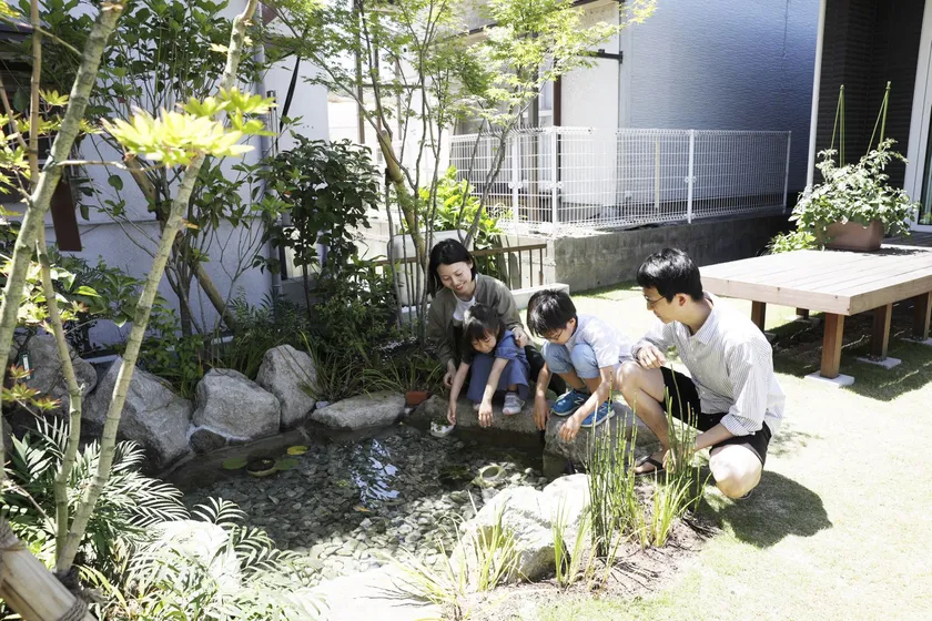 ご夫婦ともに自然が大好きで、山登りやキャンプなどのアウトドアを楽しんでいるKさんご一家。新しい家には、念願の庭と、日ごろからよく行く植物園で「こんな池があったらいいね」と息子さんが欲しがっていた池も作ろうと考えました。