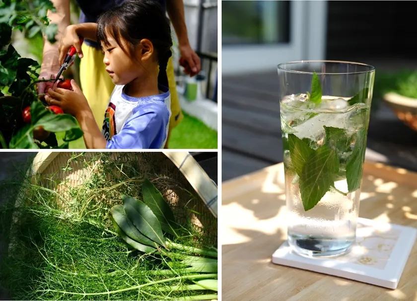 家族で育てたトマトの収穫(左上)庭で採れた月桂樹の葉(ローリエ)など(左下)妻のAさん手作りのミント入りモヒート(右)