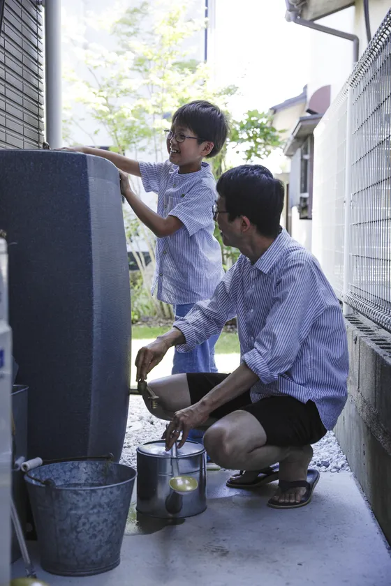 もう1つのお気に入りは「雨水タンク」です。妻のAさんのお母様が実家で雨水タンクをDIYで作り、毎日欠かすことのできない花の水やりに雨水を利用し、エコの観点からも「あってよかった」と話されていたことから、Kさんご一家も設置することにしました。今では、家族全員が花の水やりに利用するなど、とても役立っています。また、いざという時の防災面でも設置してよかったとKさんはいいます。