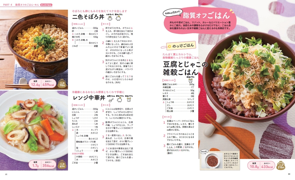 本書ではすべてのレシピに、脂質量・カロリー量・食材費目安を掲載。