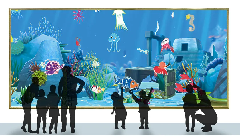 巨大スクリーンの水槽に自分の絵が自由に泳ぎ回る様子が映し出されるとともに、センサーを使ったインタラクション機能により、スクリーンの絵に触れると絵に付けた名前が表示されます。絵の上手い下手は関係なく、色や形により動き方が変化するため、お子様から大人までみんなで楽しめます。