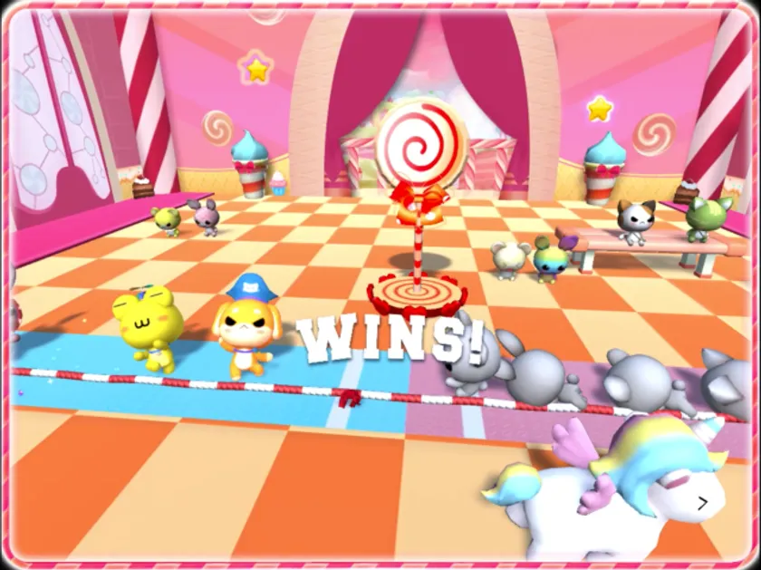 …ボタンを押すことで動物キャラクターを動かして、棒のぼり・つなひき大会・ジャンプゲームにチャレンジ!