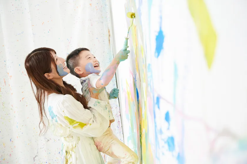 3.6m×2.4mの壁と3.6m×3mの床にセットした紙や白い服に、刷毛やローラー、スポンジ等のペイントグッズを使って、自由にペイントできます。体全身を使って、壁いっぱいに絵の具を飛び散らせば、おうちじゃできないアート体験を楽しめます。1組貸切のプライベートスタジオのため、周りを気にせず、自由に遊べます。また、感染症の不安やリスク低減にも期待できます。フォトスタジオSOY!のプロカメラマンがペイント風景を撮影し、記憶にも記録にも残る写真体験をご提供いたします。