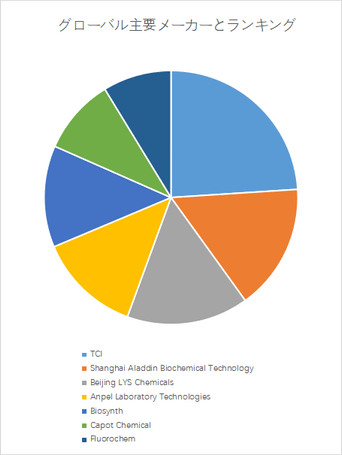 現行市場は依然として少数の専門化学企業によって主導されている。主要企業としては、研究開発型メーカーであるTCI、合成試薬に強みを持つShanghai Aladdin Biochemical Technology、Beijing LYS Chemicals、Anpel Laboratory Technologies、Biosynth、Capot Chemical、Fluorochemなどが挙げられる。これらの企業は、高純度製品の安定供給体制とともに、受託合成(Custom Synthesis)や用途別最適化サービスを通じて差別化を進めている。特にTCIやBiosynthはグローバル研究機関との連携を強化し、バイオベース誘導体の応用分野拡大に取り組んでいる。一方で、中国勢の台頭は顕著であり、Shanghai AladdinやCapot Chemicalなどは低コスト・高品質の両立を武器に、欧米市場での存在感を急速に高めている。市場は寡占的でありながら、製品多様化とサステナビリティ志向の加速によって再編の可能性も高まっている。