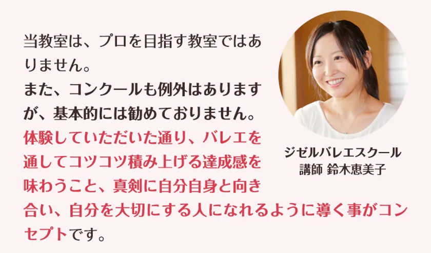 ジゼルバレエは、バレエに触れるキッカケの間口を広げ、バレエのハードルが高い、もしくは別世界と思われがちなイメージから離れた、親しみやすいバレエ教室を目指しています。コンクールを目指すことだけが、バレエ教室の正しい姿だとは思っていません。