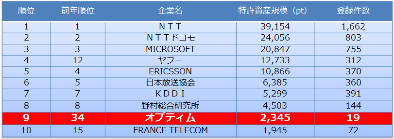 株式会社オプティム(東京本社:東京都港区、代表取締役社長:菅谷 俊二、以下 オプティム)は、株式会社パテント・リザルトが発表する「情報通信 特許資産規模ランキング」第9位となりました。また、表1の内容より、特許資産規模を登録件数で割った1件当たりの特許資産規模では、第1位となります。