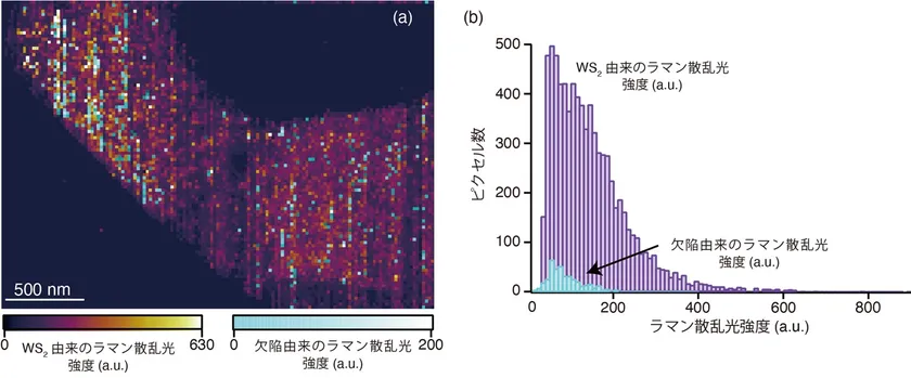(b) 画像内でWS2と欠陥のラマン散乱信号がそれぞれ検出されたピクセル数の比較。応用先であるデバイスと同規模の面積内において、欠陥構造はWS2表面の5%の割合を占有していることを明らかにした。