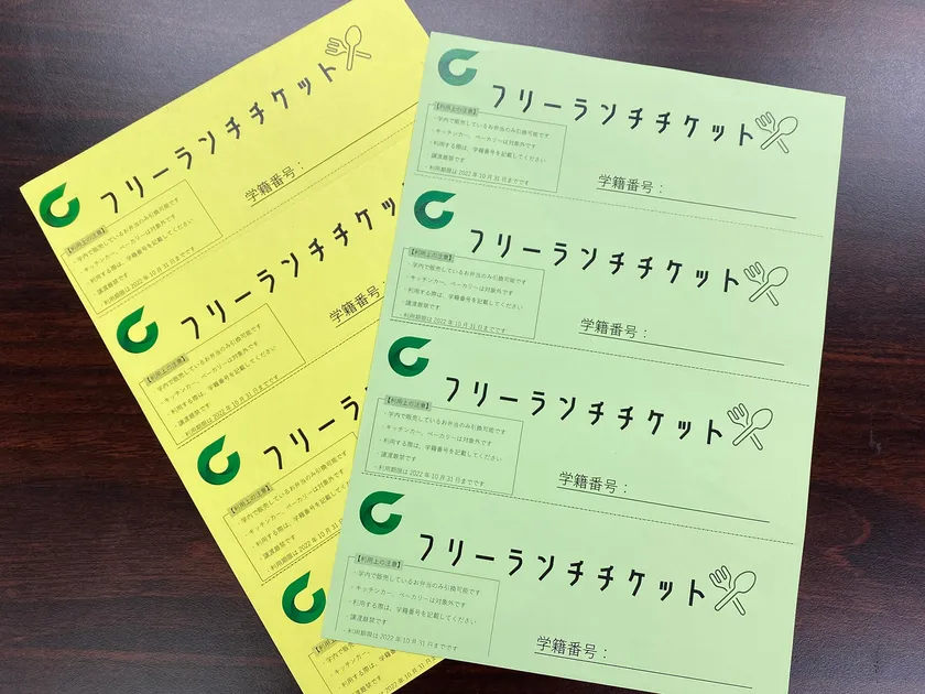 なお、「フリーランチチケット」配布は、本学後援会からの寄付、また、大学独自の支援に対して交付される学生支援機構からの助成金を活用しています。「食」によって健やかな学生生活を支え、学びの機会とモチベーションを維持するために後援会をはじめ全学的な協力体制のもと今回の「フリーランチチケット」の配布が実現しました。引き続き、学生の実情を的確に把握しながら、きめ細やかな支援を継続して行ってまいります。